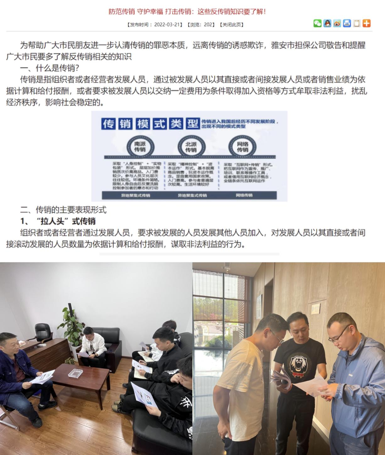 在打擊傳銷“宣傳教育周”活動中,市擔(dān)保公司一方面通過官網(wǎng)、微信群、分組學(xué)習(xí)等方式,積極向員工宣傳打擊傳銷知識;另一方面利用外出辦理業(yè)務(wù)的機(jī)會,廣泛地向公司客戶宣傳禁止傳銷的法律法規(guī)。實(shí)現(xiàn)了多渠道、多層面、多角度、多形式開展宣傳警示活動,揭露傳銷行為的欺騙本質(zhì)和危害性,增強(qiáng)干部職工及客戶辨識、防范傳銷能力,提高自我防護(hù)意識,營造全社會共同參與打擊傳銷的氛圍,維護(hù)社會和諧穩(wěn)定,為我市經(jīng)濟(jì)社會全面協(xié)調(diào)發(fā)展服務(wù)。