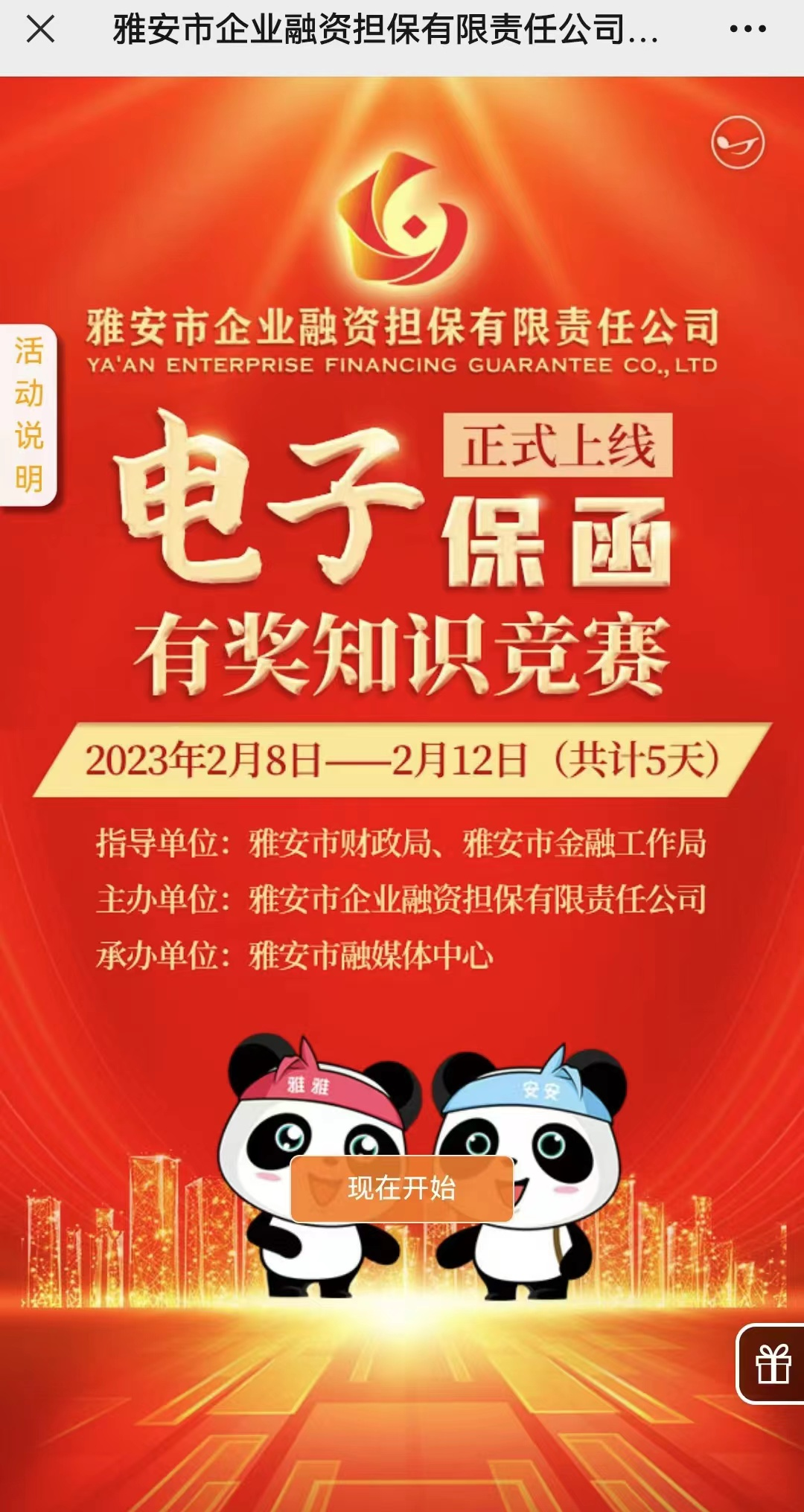 該活動(dòng)由市財(cái)政局和市金融工作局指導(dǎo),雅安市企業(yè)融資擔(dān)保有限責(zé)任公司(以下簡(jiǎn)稱“市擔(dān)保公司”)主辦,雅安市融媒體中心承辦。市擔(dān)保公司作為我市唯一一家政府性融資擔(dān)保機(jī)構(gòu),也是雅安公共資源交易中心上線的唯一一家本地全類別保函服務(wù)商。2月6日,市擔(dān)保公司“電子投標(biāo)保函”業(yè)務(wù)在雅安公共資源交易中心正式上線。為讓更多的受眾了解“電子投標(biāo)保函”業(yè)務(wù),市擔(dān)保公司主辦了此次線上有獎(jiǎng)知識(shí)競(jìng)賽活動(dòng)。