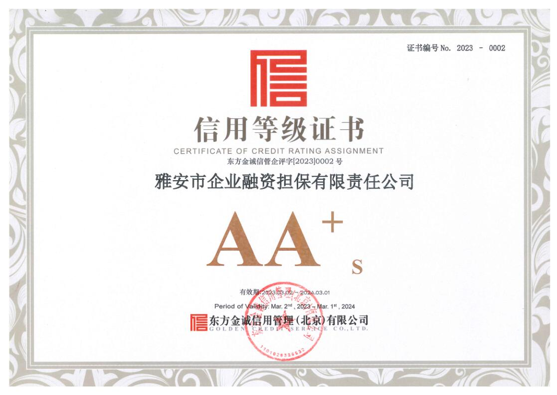 3月3日,雅安市企業(yè)融資擔(dān)保有限責(zé)任公司(以下簡(jiǎn)稱“市擔(dān)保公司”)傳來(lái)喜訊,經(jīng)東方金誠(chéng)信用管理(北京)有限公司通過(guò)對(duì)市擔(dān)保公司的信用狀況進(jìn)行綜合分析和評(píng)估,確定該公司信用等級(jí)為AA+。