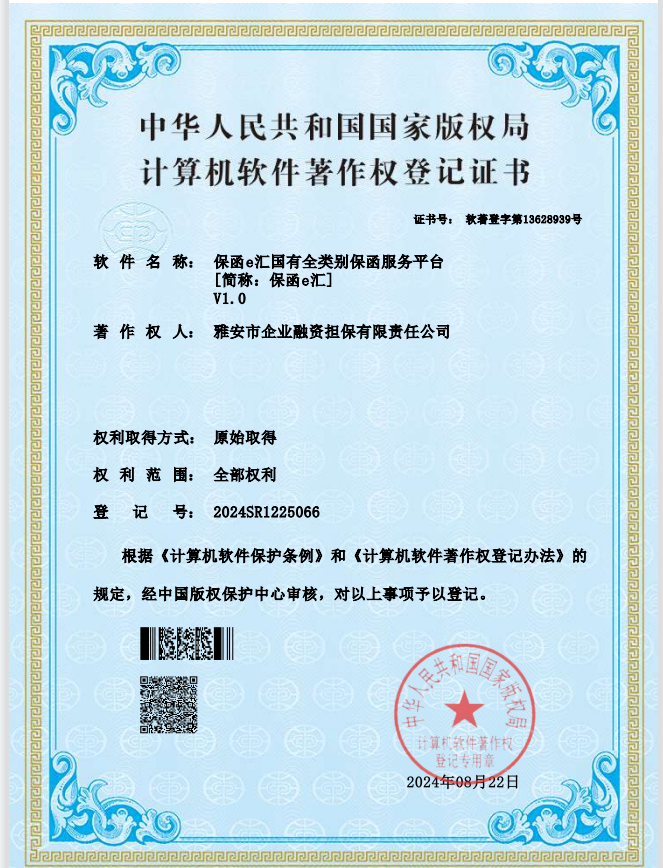 近日,由雅安市擔保公司開發(fā)完成的《保函e匯國有全類別保函服務(wù)平臺(簡稱:保函e匯)V1.0》軟件通過國家版權(quán)局的最終審查,獲得由中華人民共和國版權(quán)局頒發(fā)的計算機軟件著作權(quán)登記證書。